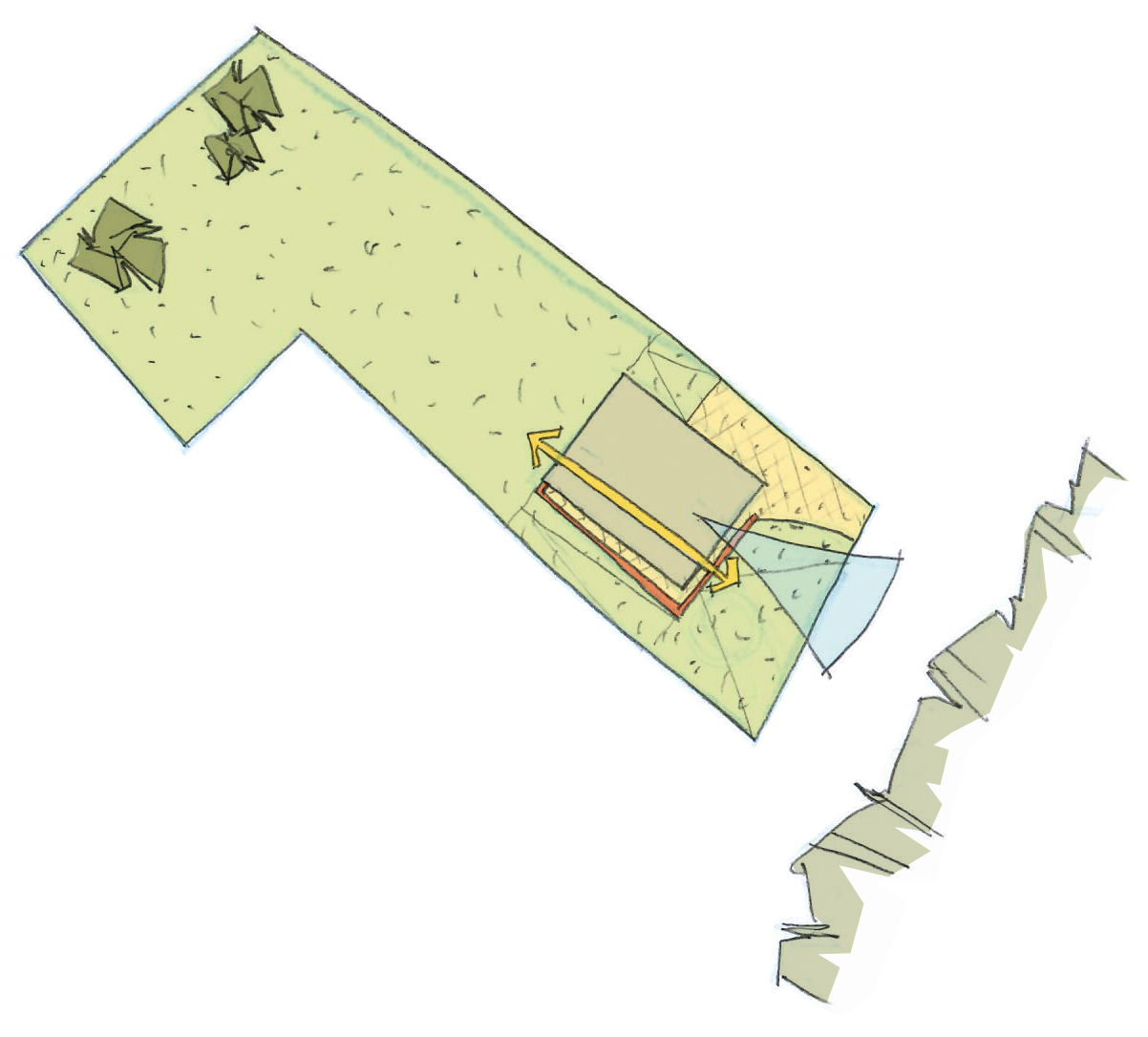 Op een sterk hellend perceel bouwen we een vrijstaande eengezinswoning met twee bovengrondse bouwlagen, voorzien van een hellend dak, en een half ingegraven verdieping op niveau van de straat. Het gelijkvloers van de woning, op niveau van het maaiveld van de achtertuinzone, bestaat uit een aaneengesloten open ruimte waarin keuken, eethoek, zithoek en bureau in elkaar overvloeien. Een centrale vaste kern die toilet en bergruimtes omvat, vormt daarbij het belangrijkste ruimte scheidende element. Op de verdieping vinden we vier slaapkamers, een badkamer en apart toilet terug. Een vide in de hoek van de verdieping laat zuiderzon toe op het lagergelegen gelijkvloers. De woning wordt ontsloten via een half ingegraven verdieping op niveau van de straat, dewelke plaats biedt aan een centrale inkomhal, een garage en twee bergruimtes, waarvan één voor fietsen. Hiertoe zal het talud aan de straat afgegraven worden over de breedte van de oprit. Verder wordt het niveauverschil opgevangen door de woning zelf.