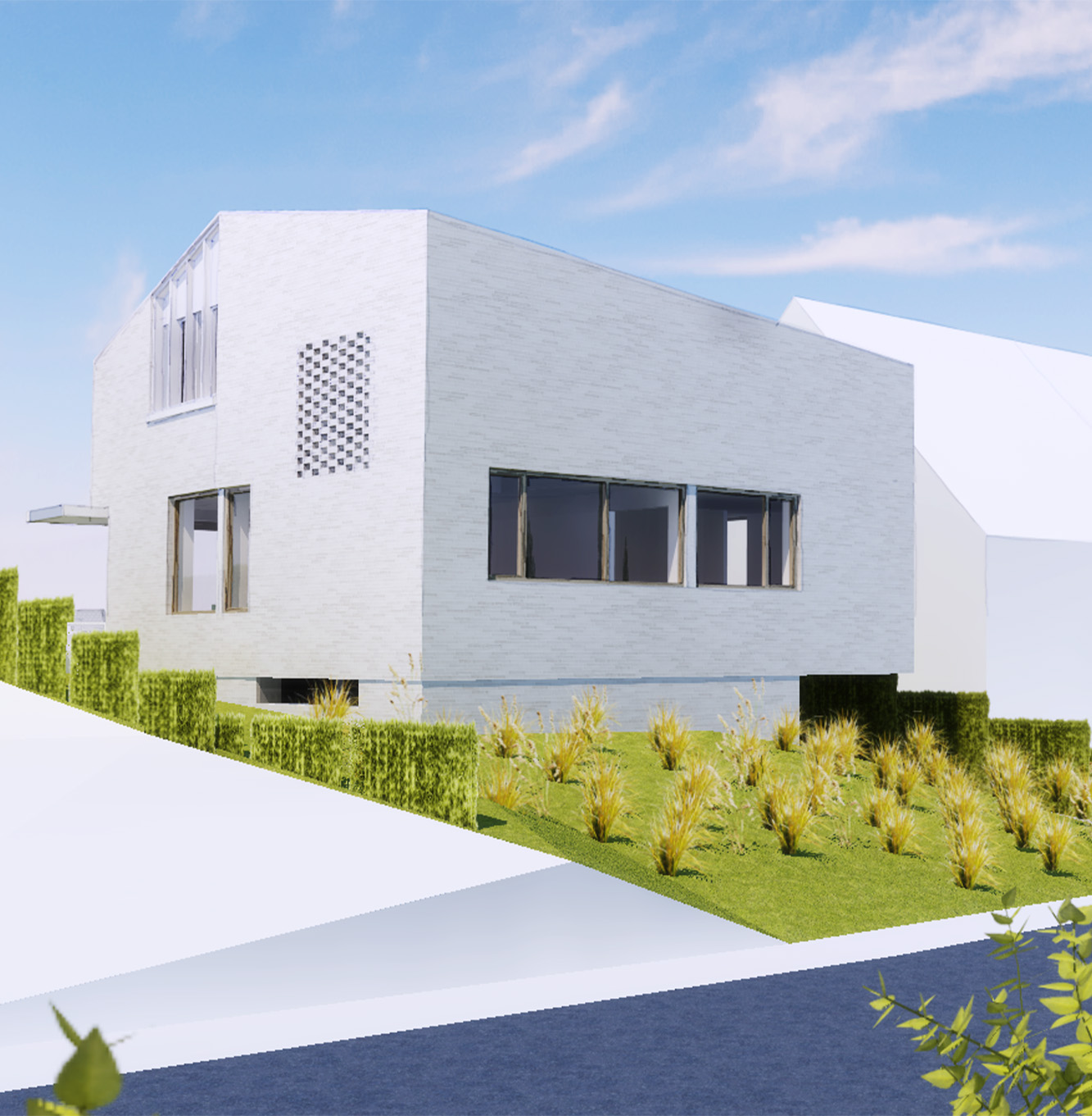 Een grondige renovatie met optopping laat ons toe een hedendaagse eengezinswoning te bekomen, waarbij zowel het gelijkvloers als de verdieping opgebouwd zijn rondom een centrale kern met trap. Het gelijkvloers is daarbij ontworpen als een open plan, waarin zithoek, leeshoek, eethoek, keuken en bureauhoek rondom deze kern geplooid zijn. Eet- en zithoek genieten daarbij van maximaal zicht op de eigen tuin, lees- en bureauhoek richten zich op de zij- en voortuinstroken die op een kwalitatieve manier zullen ingegroend worden. Op de verdieping worden, naast vier slaapkamers (waarvan 1 met dressing), eveneens een badkamer, wasberging ondergebracht. Enkele goedgekozen gevelopeningen en een terras bieden zicht en contact met de omgeving. We kiezen daarbij voor een lichte materialiteit die bijdraagt tot een warm en uitnodigend karakter.