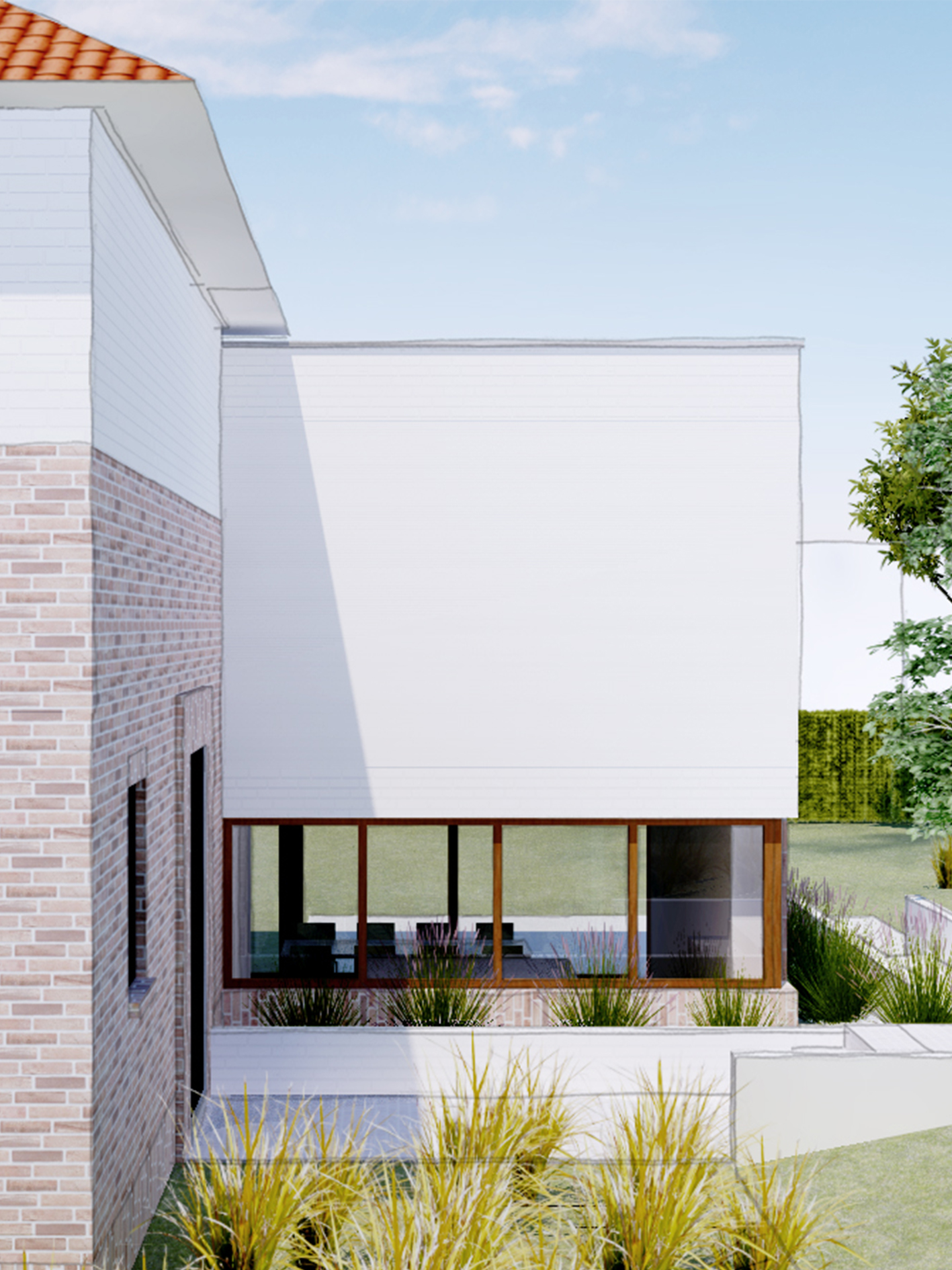 Een karaktervolle woning in bebost gebied wordt uitgebreid met een voornamelijk gelijkvloers volume om tot een woning te komen die aan de hedendaagse normen voldoet. We zorgen voor een uitbreiding die maximaal rekening houdt met zichtlijnen naar de tuin, die reeds met zorg werd aangepakt. Het wordt een uitbreiding met vloeiende lijnen en luifels, die het karakter van de bestaande woning respecteren en op een speelse manier contact zoeken met de omgeving. We kiezen voor lichte en frisse materialen die het geheel een warme uitstraling geven en tegelijk het contrast opzoeken met de natuur rondom.